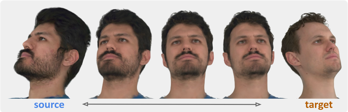 Our approach supports both images and 3D Gaussian data. Below, we show morphing between both face images and 3D Gaussian Splatting faces.