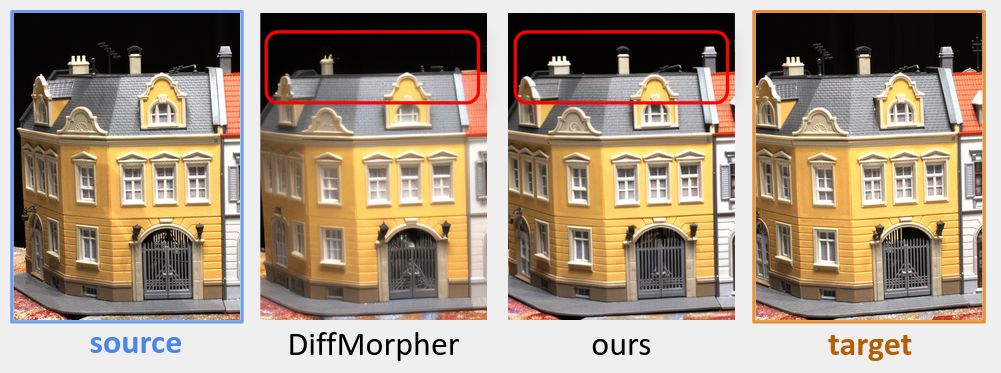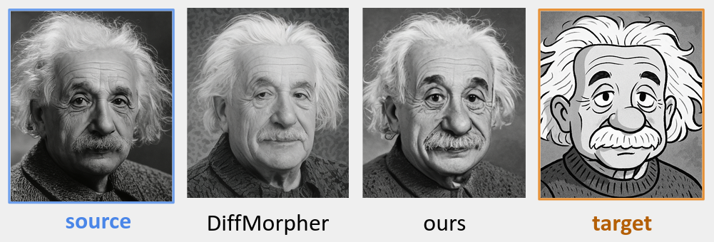 Proper warping before blending may be used for better feature transfer. On the example below, we morph two pictures of Albert Einstein, one real and a sketch. Notice how the sketch's traces are more present on our morphing (third column), compared to state-of-the-art generative morphing (diffmorpher, second column)