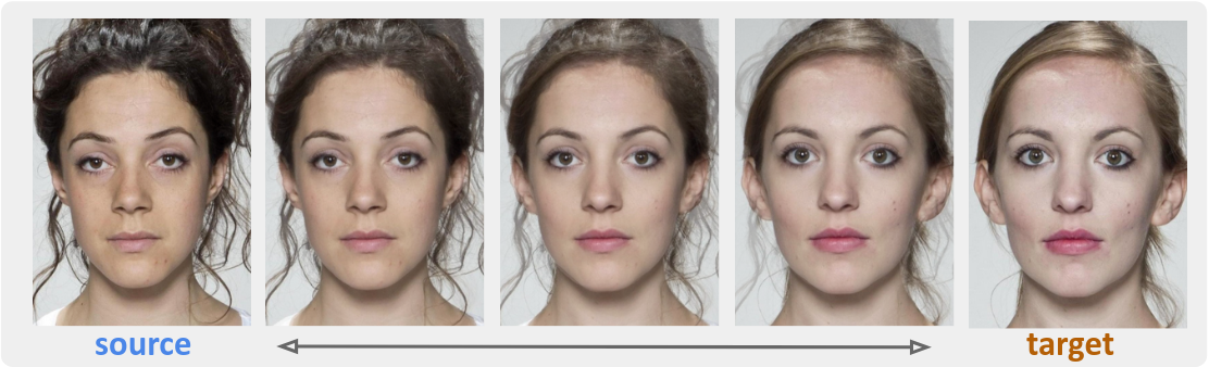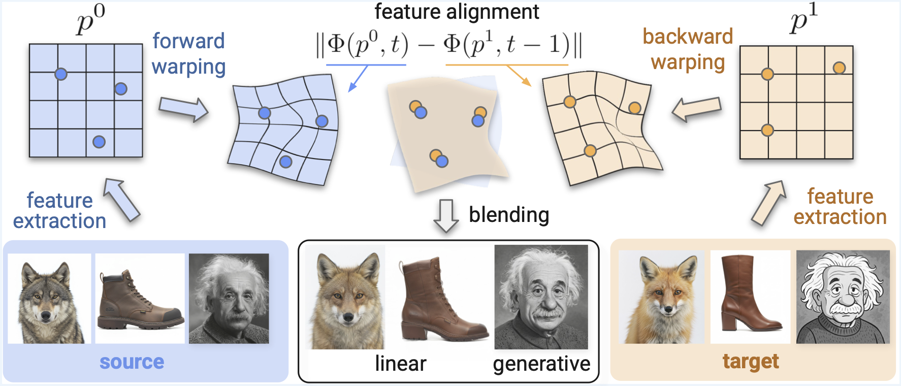 Given source and target images \(I^0, I^1\) we extract landmark pairs \((p^0_i,p^1_i)\) with a feature extractor. We train a flow \(\phi\) such that \(\phi(p^0,t) = \phi(p^1,t-1)\), effectively mapping \(p^0\) to \(p^1\). At inference, to blend the images at time \(t\), we warp \(I^0\) forward by \(t\) units and \(I^1\) and backward by \(t-1\) units, then blend them together with methods such as linear blending or generative models.